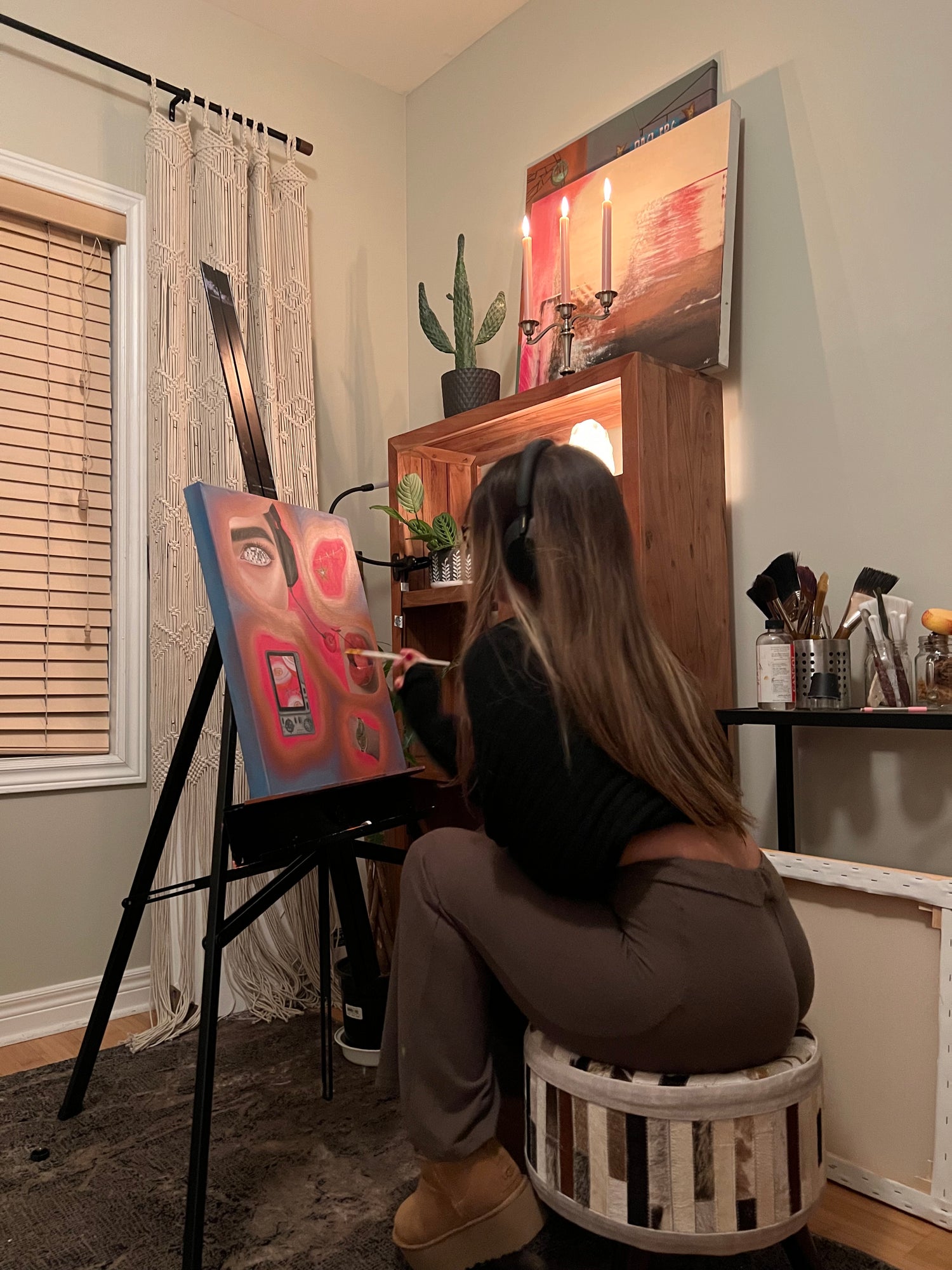 Through reflection, observation, and emotional exploration, her creative vision is brought to life through paint. Influenced by dreamy, surrealist cinematography, her style is vibrant, whimsical, comical, and deeply thought-provoking.